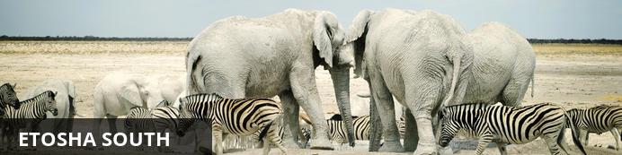 Located just south of the boundary of Etosha National Park in northwestern Namibia, Etosha South makes up the southern region of this wild paradise. Ogava Private Game Reserve shares the southern boundary with Etosha National Park and offers an array of luxury lodges overlooking picturesque landscapes dotted with abundant wildlife. The national park can be accessed via the southern entrance at Andersson’s Gate. Visitors can catch a glimpse of a variety of wildlife including: lion, giraffe, elephant, white and black rhino, and a multitude of plains game. Popular activities include: game drives, tracking rhinos on foot, guided nature walks, or watch the sunset over this magnificent landscape.
